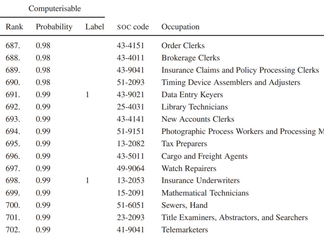 下表來自該列表。它根據職業被計算機化的可能性進行了排名。
