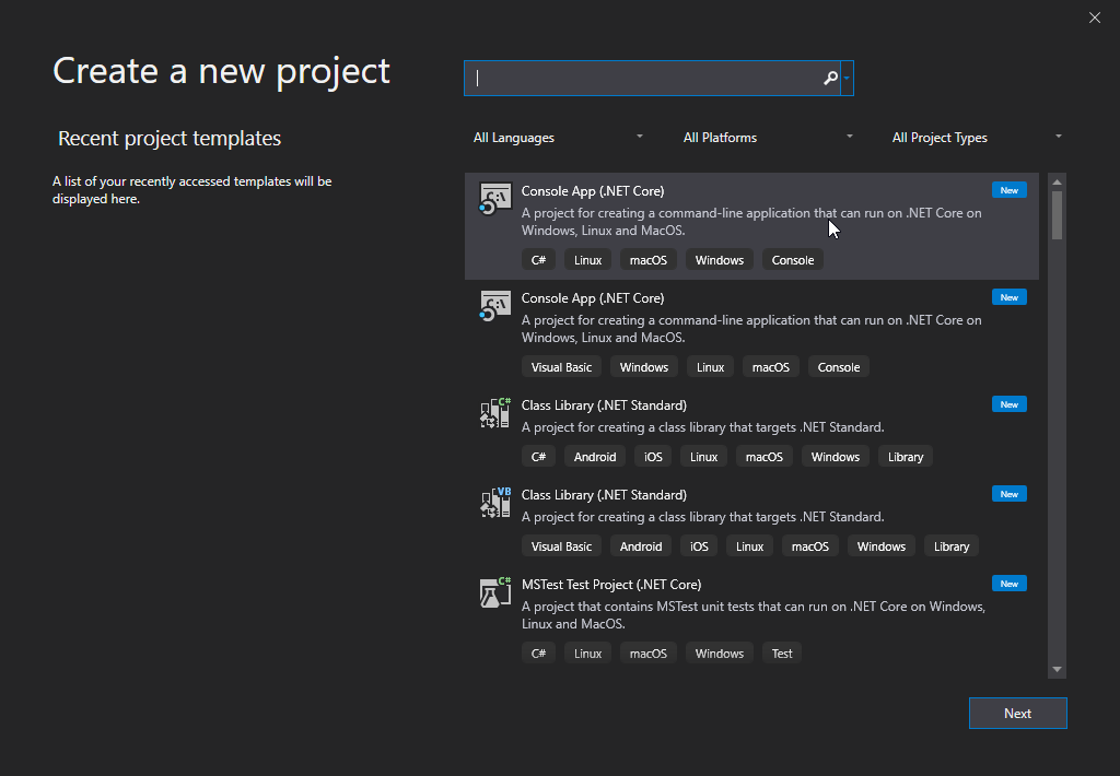 從列表中選擇“控制檯應用 (.NET Core)”並單擊“下一步”按鈕。
