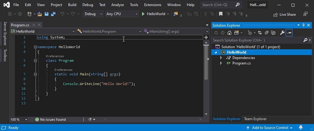Console.WriteLine("Hello World!");