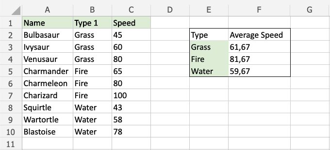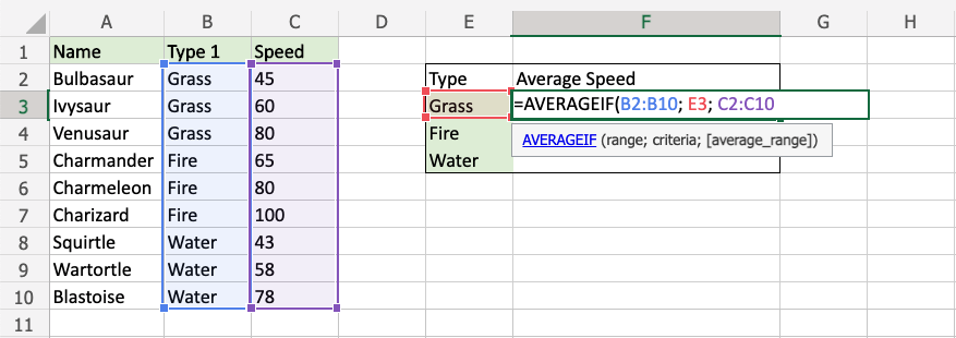 函式現在計算草系寶可夢:妙蛙種子、妙蛙草和妙蛙花的速度平均值。
