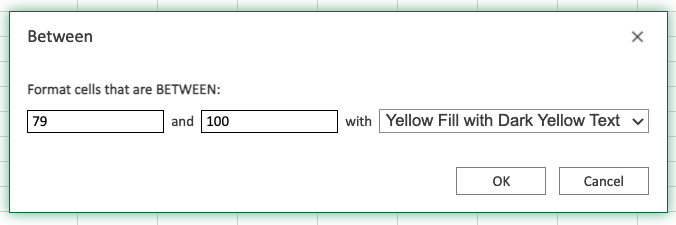 現在,值為“79”和“100”之間的單元格將被突出顯示為黃色