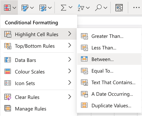 單元格突出顯示規則 - 介於兩者之間