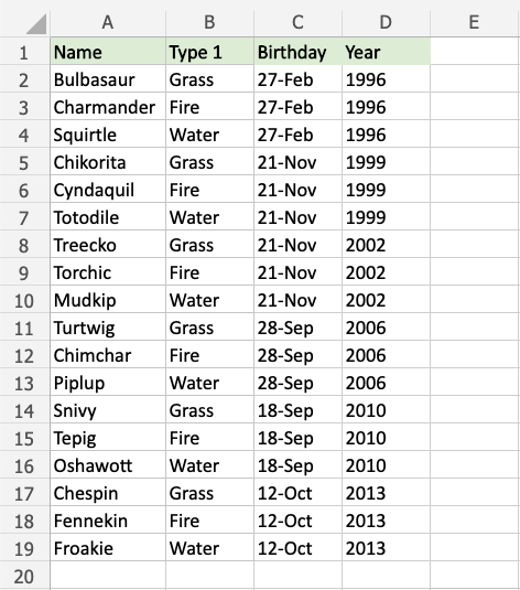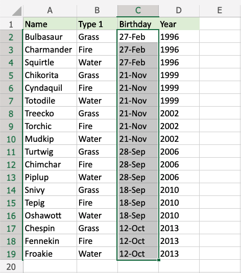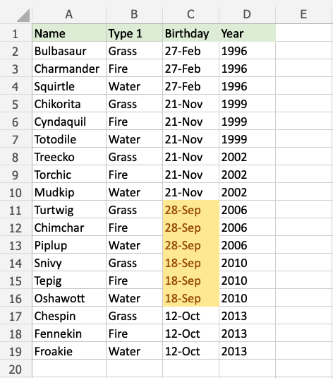 Turtwig、Chimchar、Piplup、Snivy、Tepig 和 Oshawott 的生日都在九月,因此他們的單元格被突出顯示。