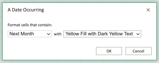 現在,值為“下個月發生”的單元格將以黃色突出顯示