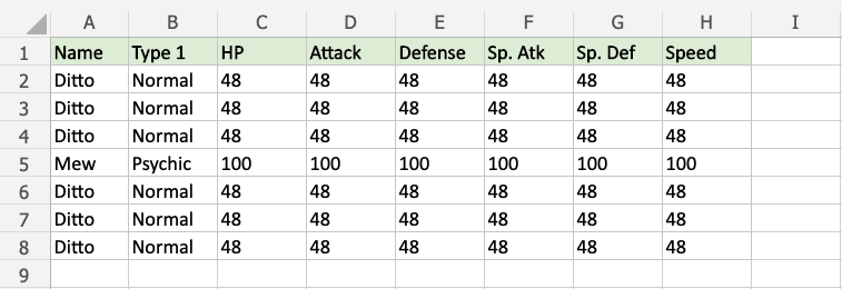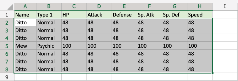 Ditto 的所有統計值都是 48,Mew 的所有統計值都是 100,因此它們都突出顯示了。