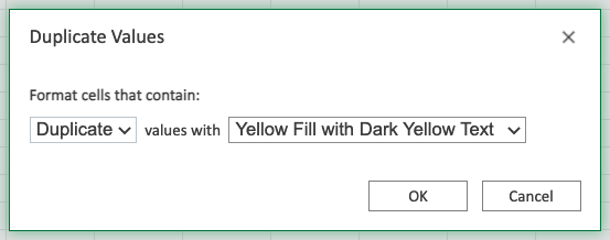 現在,範圍內與另一個單元格具有 **相同** 值的單元格將以黃色突出顯示