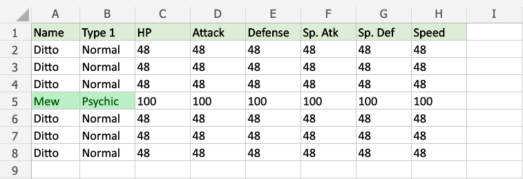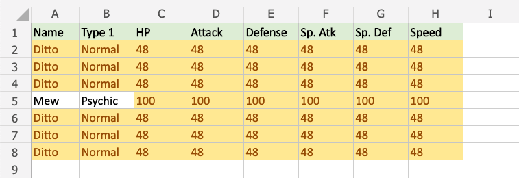 Mew 和 Psychic 在範圍內僅出現一次,因此這些值被突出顯示。