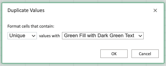 重複值... 是條件的一個選項,並且可以檢查 **重複** 和 **唯一** 值。