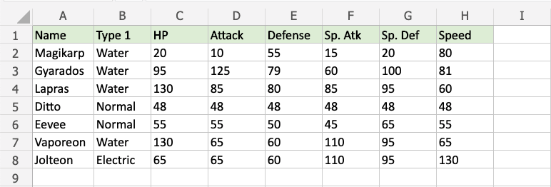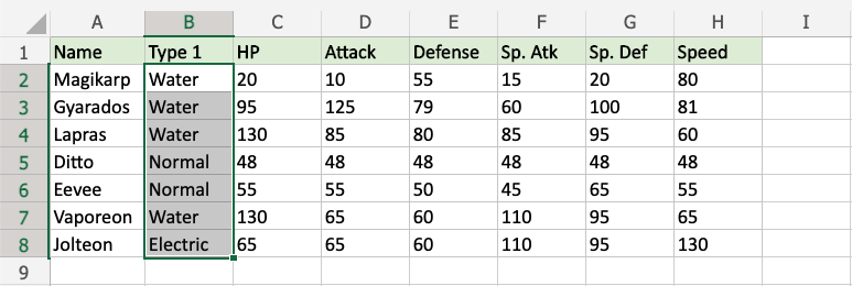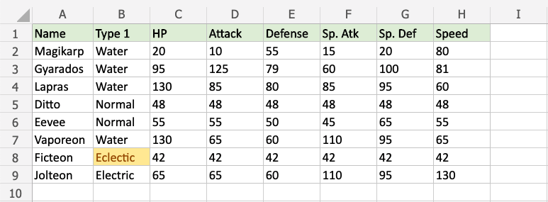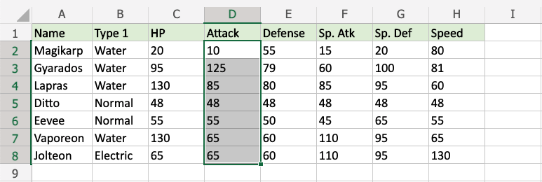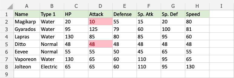只有 Magikarp 和 Ditto 的 Attack 值小於 55,因此這些值被高亮顯示。
