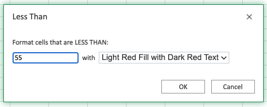 現在,小於“55”的值的單元格將以紅色高亮顯示