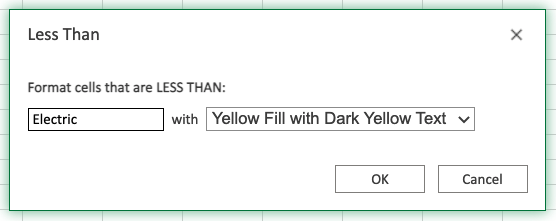 現在,字母表中早於“Electric”的文字值單元格將以黃色高亮顯示