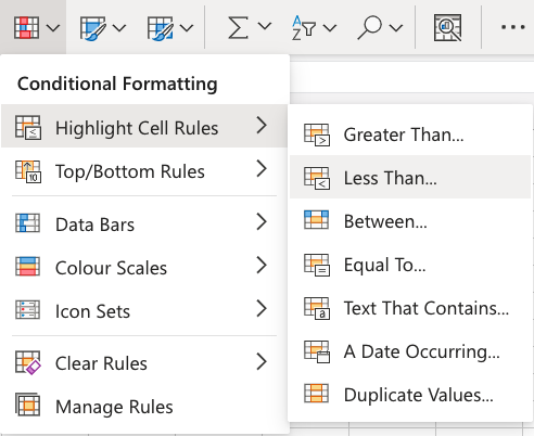 “小於...”單元格高亮規則將根據單元格值小於您指定的值,以其中一個外觀選項高亮顯示單元格。