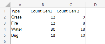 我們想找出第一世代“草”、“火”、“水”和“蟲”屬性的寶可夢數量。