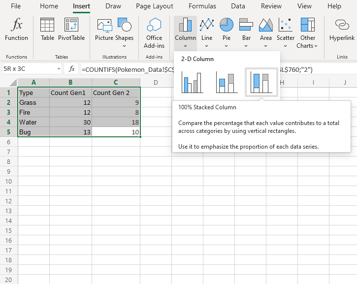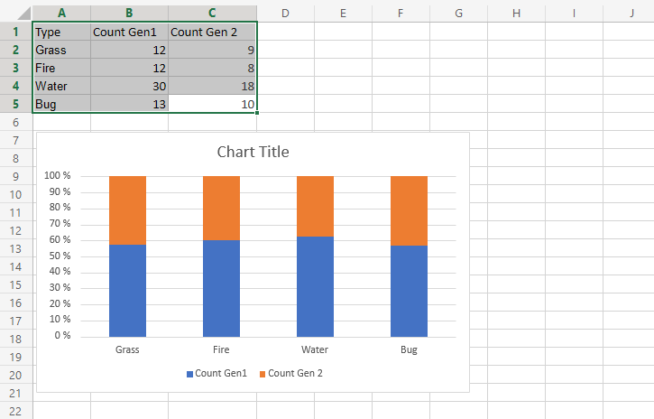 這是透過將堆積柱形圖的每個類別的**總**值縮放到 100 來實現的。