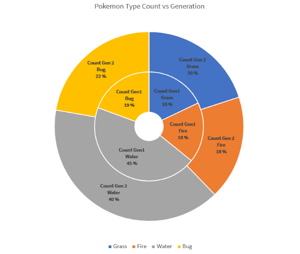 這個甜甜圈圖顯示了第一代和第二代不同寶可夢型別的比例。