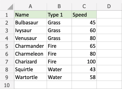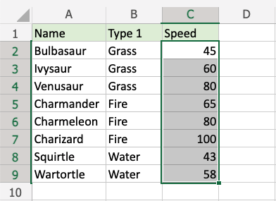 使用色階條件格式突出顯示每隻寶可夢的速度值。