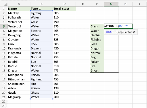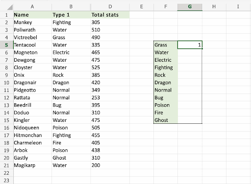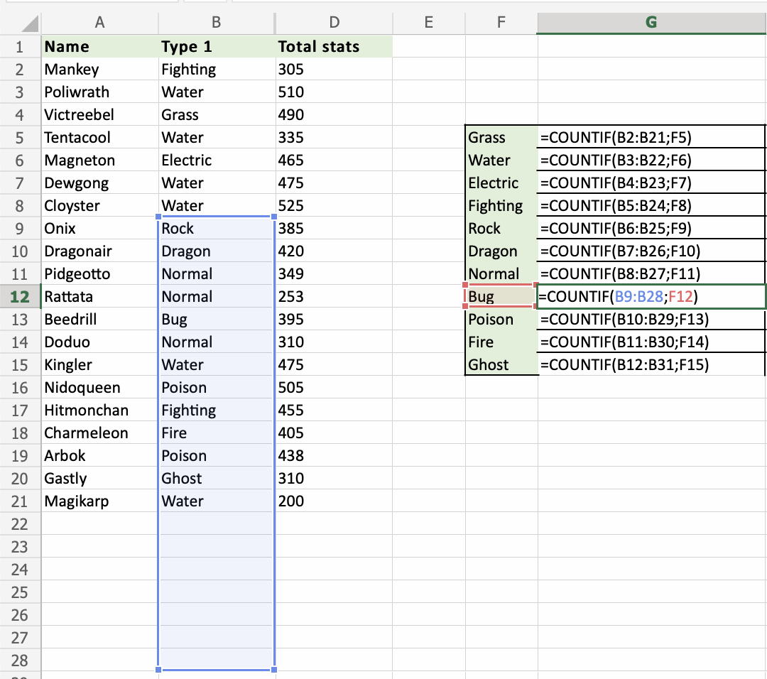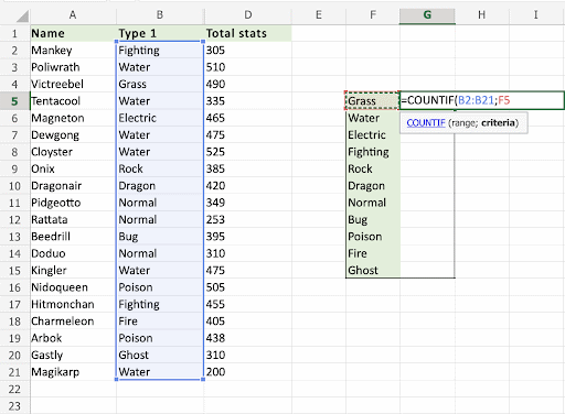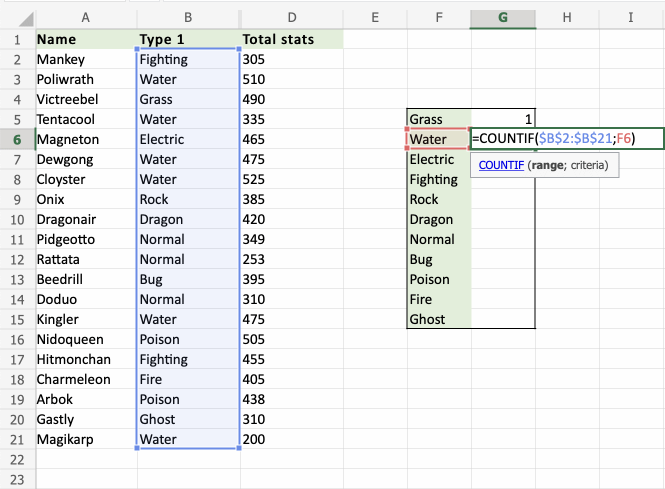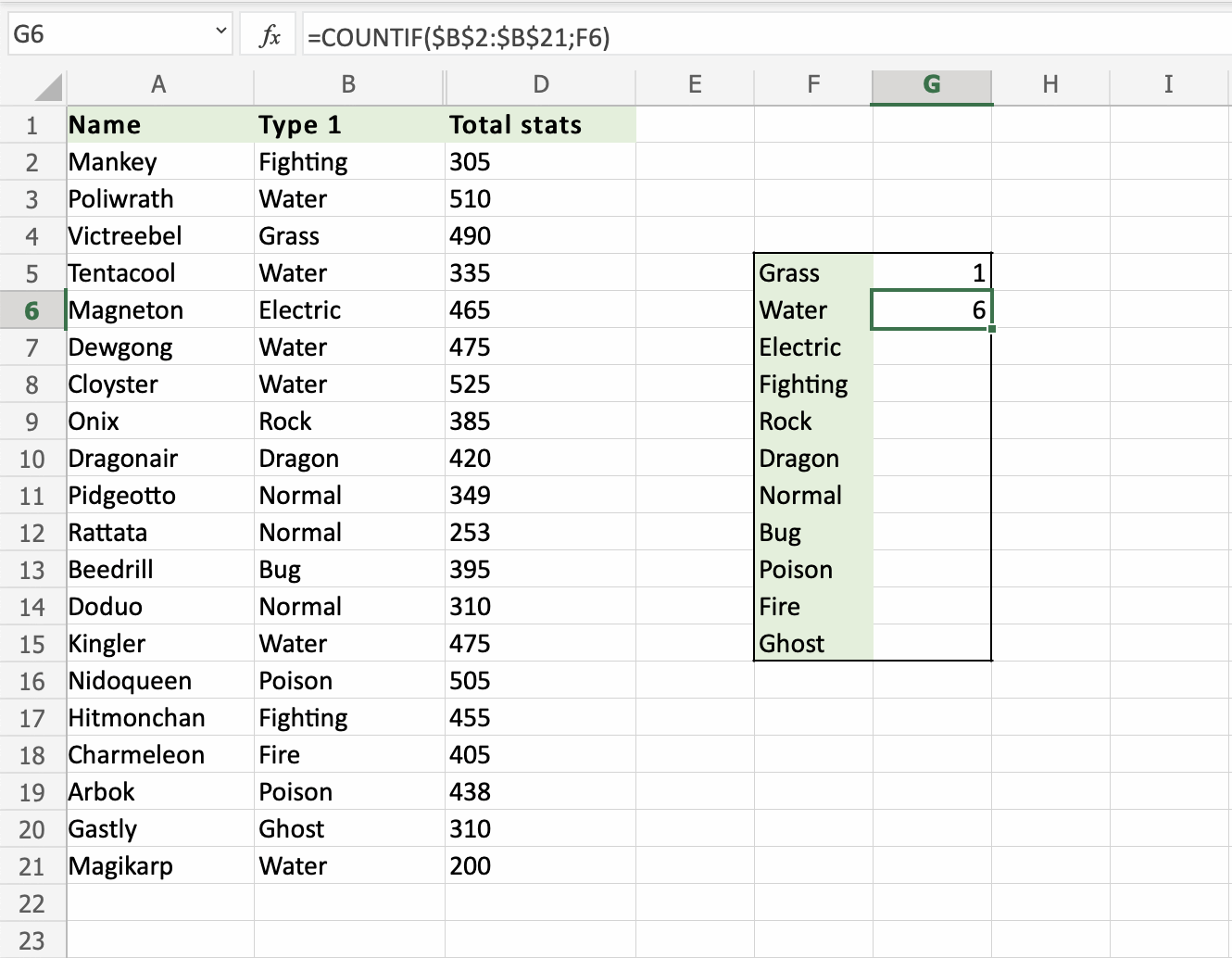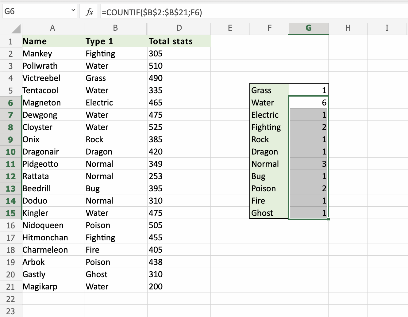 讓我們更有效地統計其餘的型別。我們想從 G6:G15
