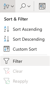 已在頂行單元格中添加了新按鈕。這表明“篩選”已成功應用。可以單擊這些按鈕來訪問不同的“排序和篩選”選項。