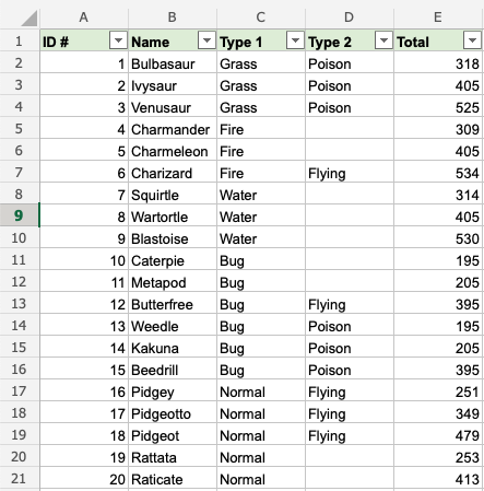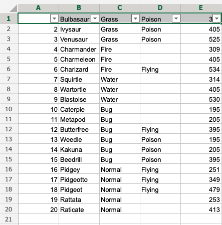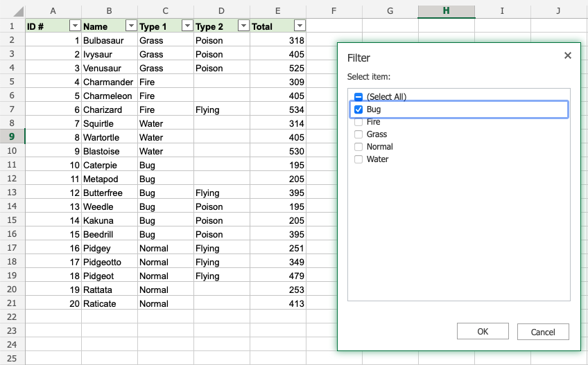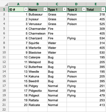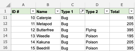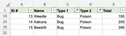 非常準確!我們已按“型別 1”、“蟲”和“型別 2”、“毒”對區域進行了排序。篩選選項有助於使區域更易於分析。