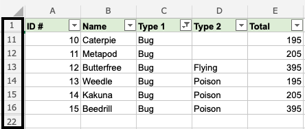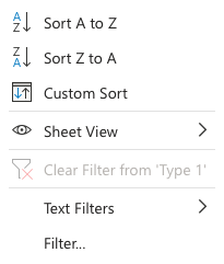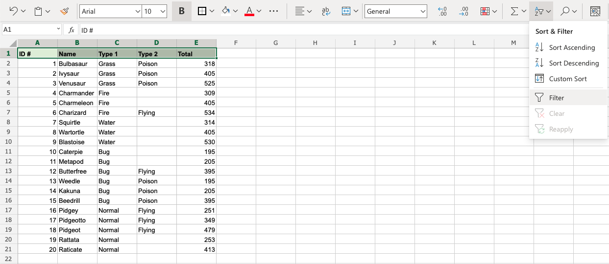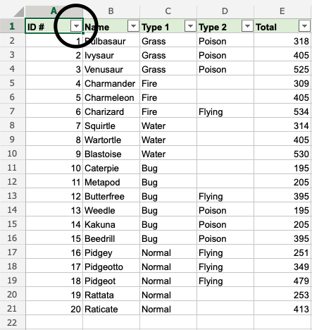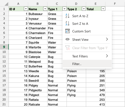 )上的下拉選單,然後選擇“篩選”選項。這是包含“型別 1”資料的列。