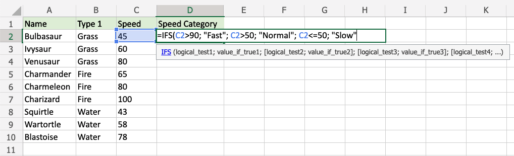 =IFS(logical_test1, value_if_true1, [logical_test2, value_if_true2], [logical_test3; ...)