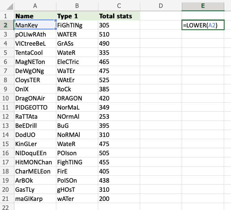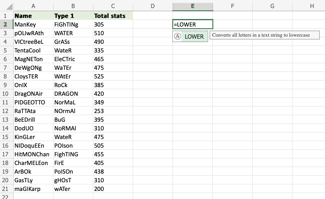 LOWER 函式用於將單元格中的文字轉換為小寫。