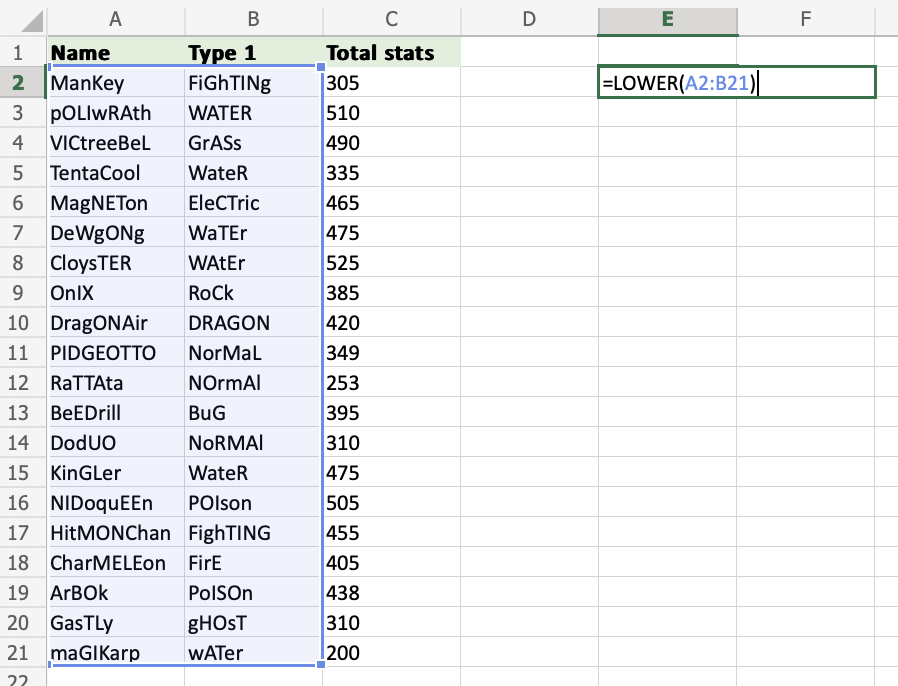 步驟 3) 定義範圍以將 LOWER 函式用於多個單元格