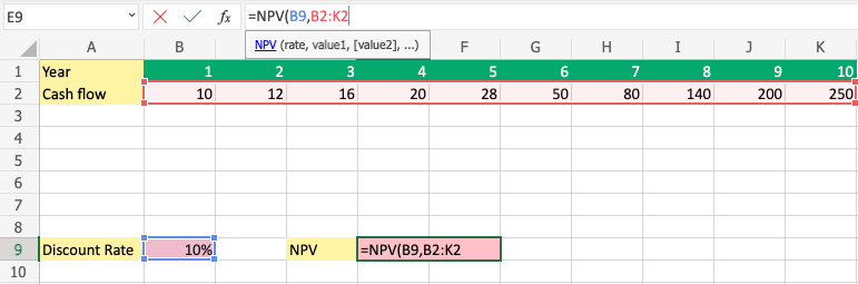 =NPV(rate, value1, value2, ...)