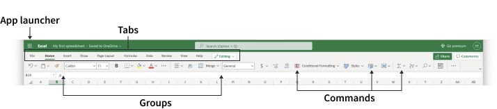 功能區由應用啟動器、選項卡、組和命令組成。在本節中,我們將解釋功能區的不同部分。