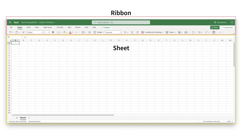 請看下面的圖片。功能區用紅色矩形標記,工作表用黃色矩形標記。