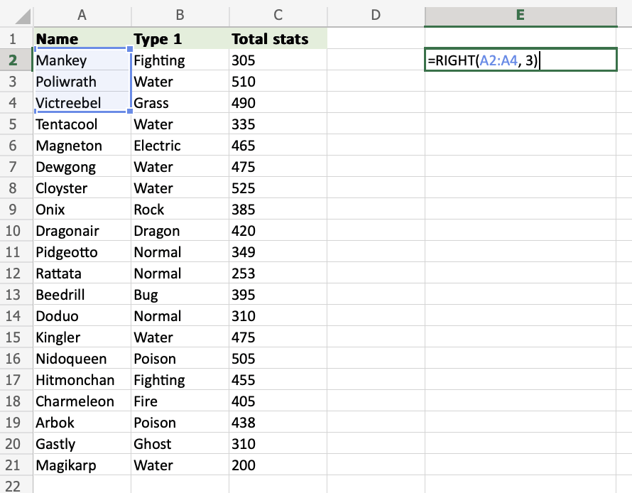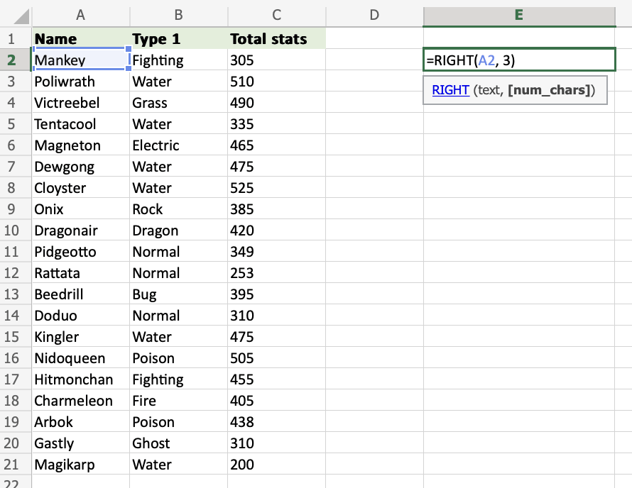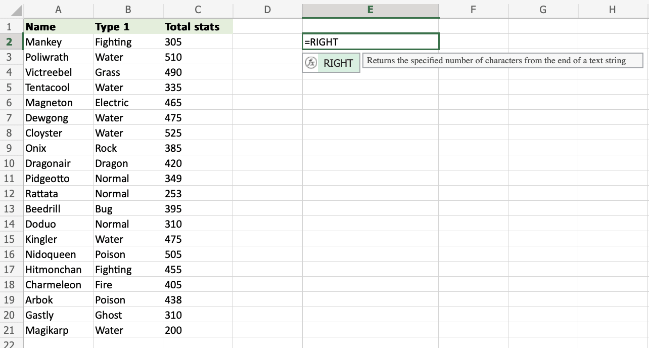 要從 Excel 單元格的右側檢索值,請使用 RIGHT 函式。