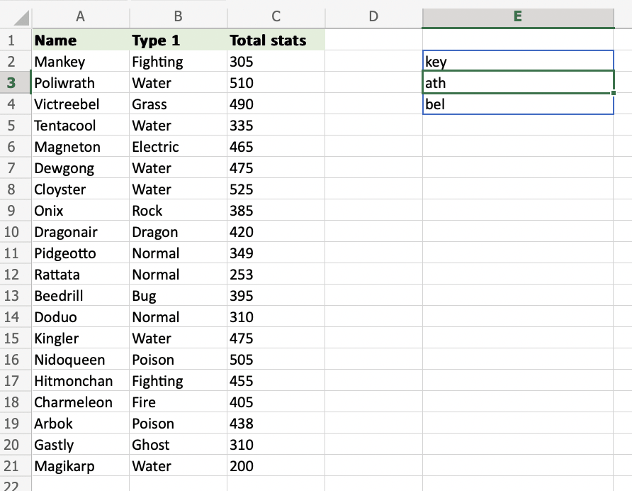 作為分隔符定義要檢索的字元長度(A2:A4,3