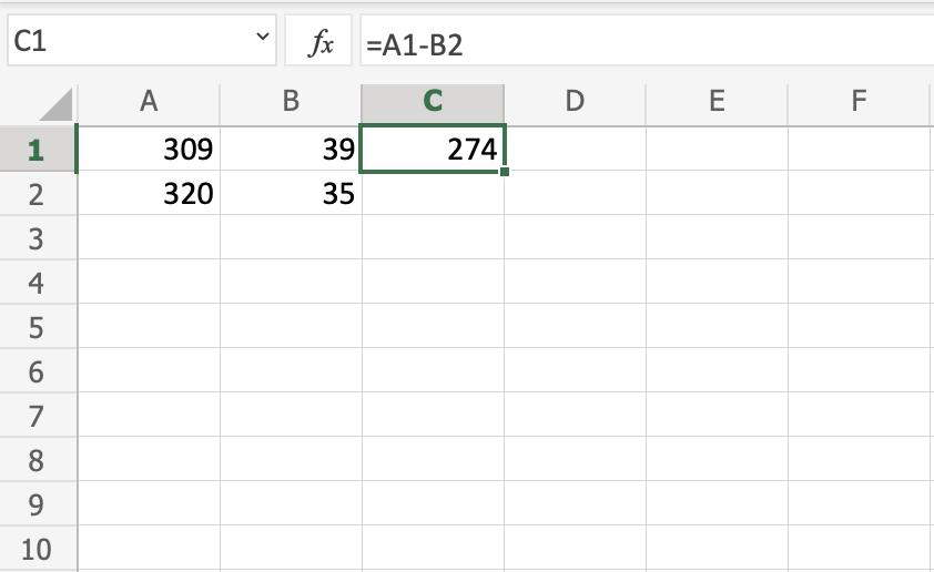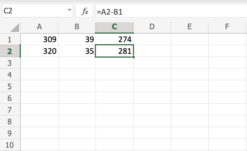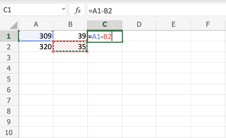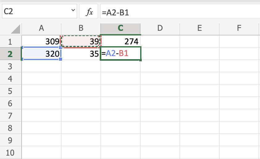 讓我們再嘗試一個示例,這次我們來建立公式 =A2-B1