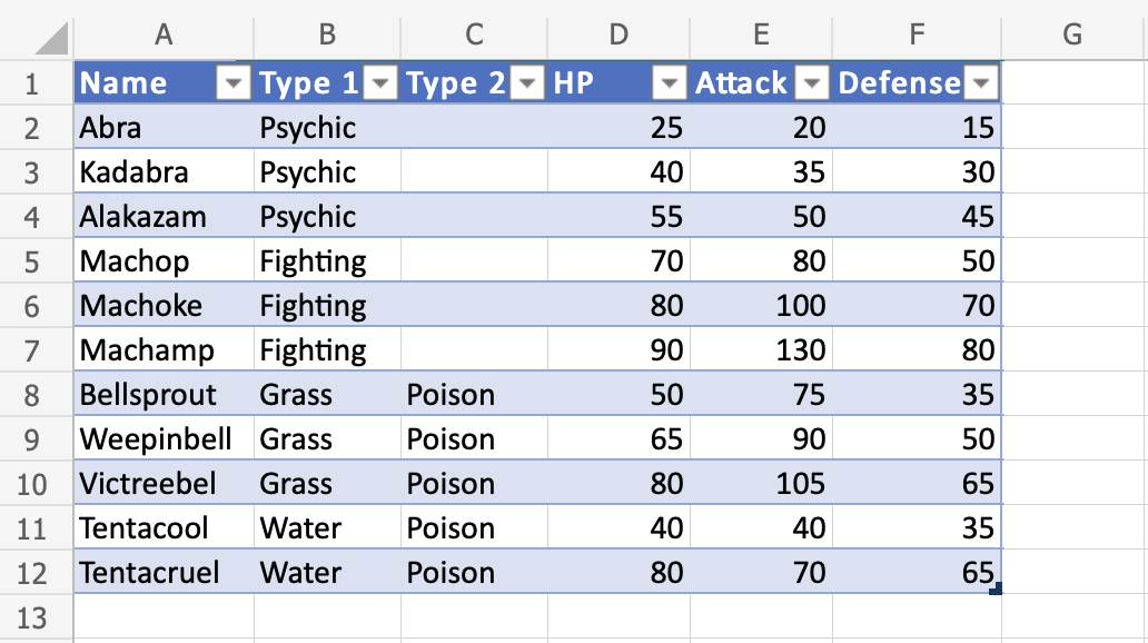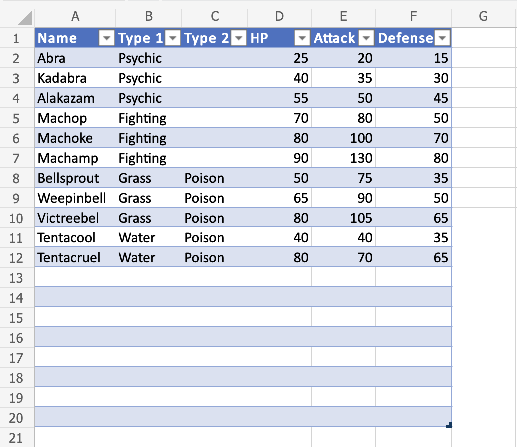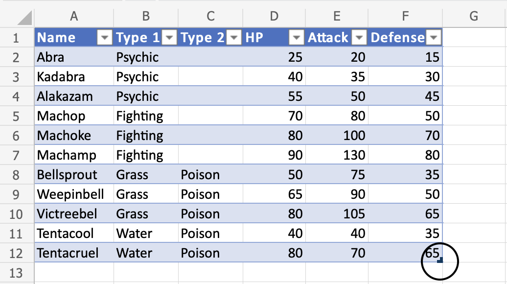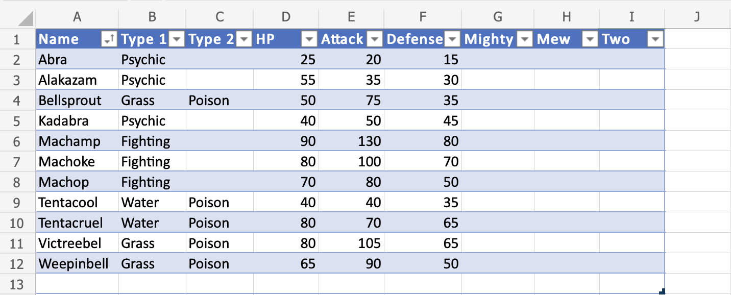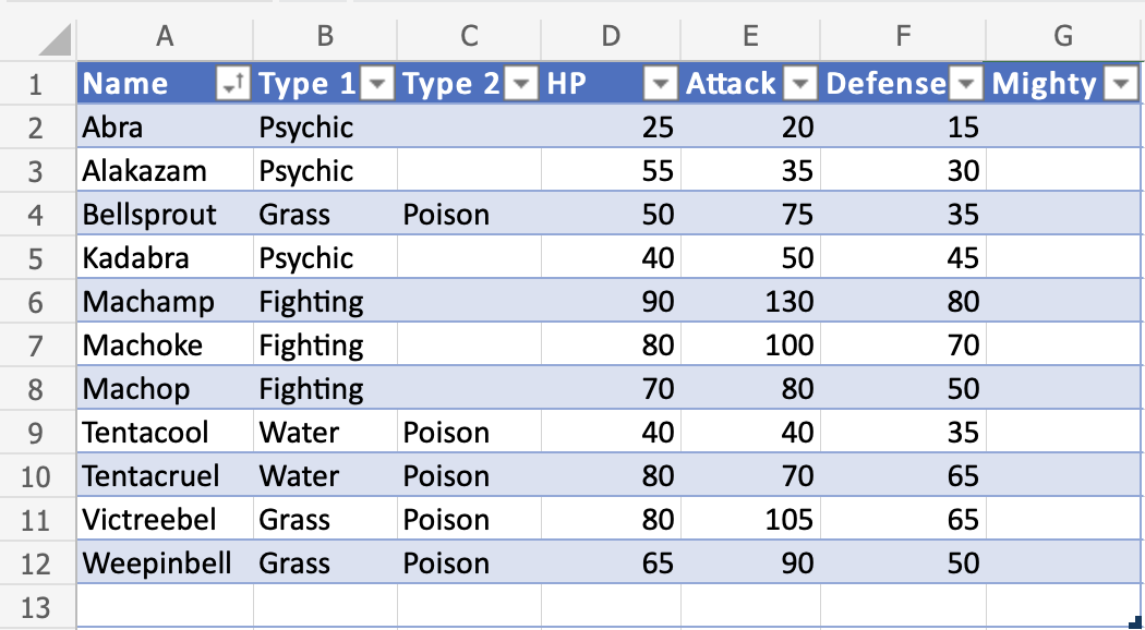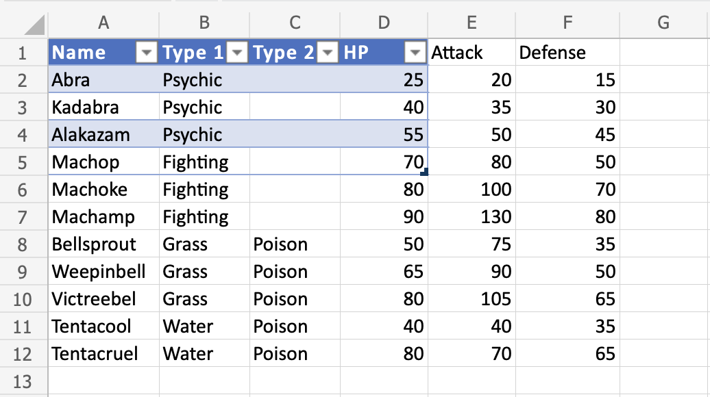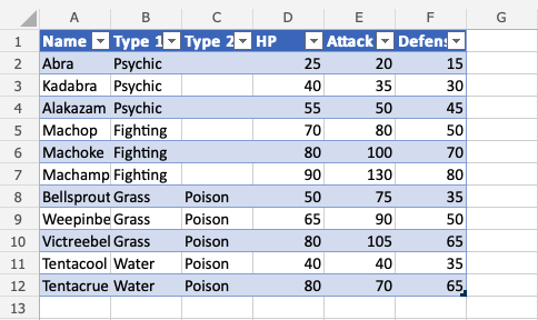 篩選選項僅包含表格範圍內的寶可夢(A1:A5