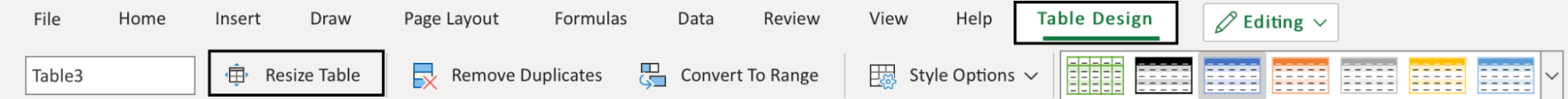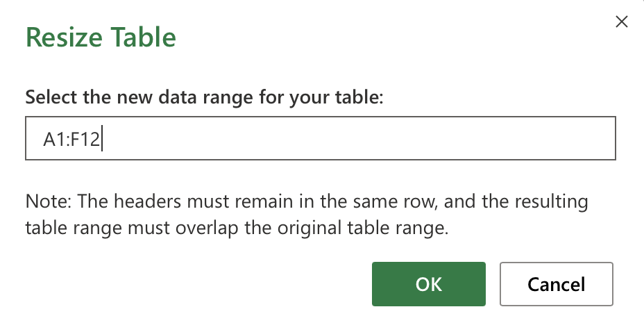 調整表格命令允許您透過輸入範圍來更改表格的大小。