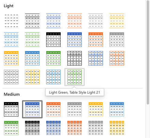 - 點選淺色類別中的淺色,綠色,表格樣式淺色 21。