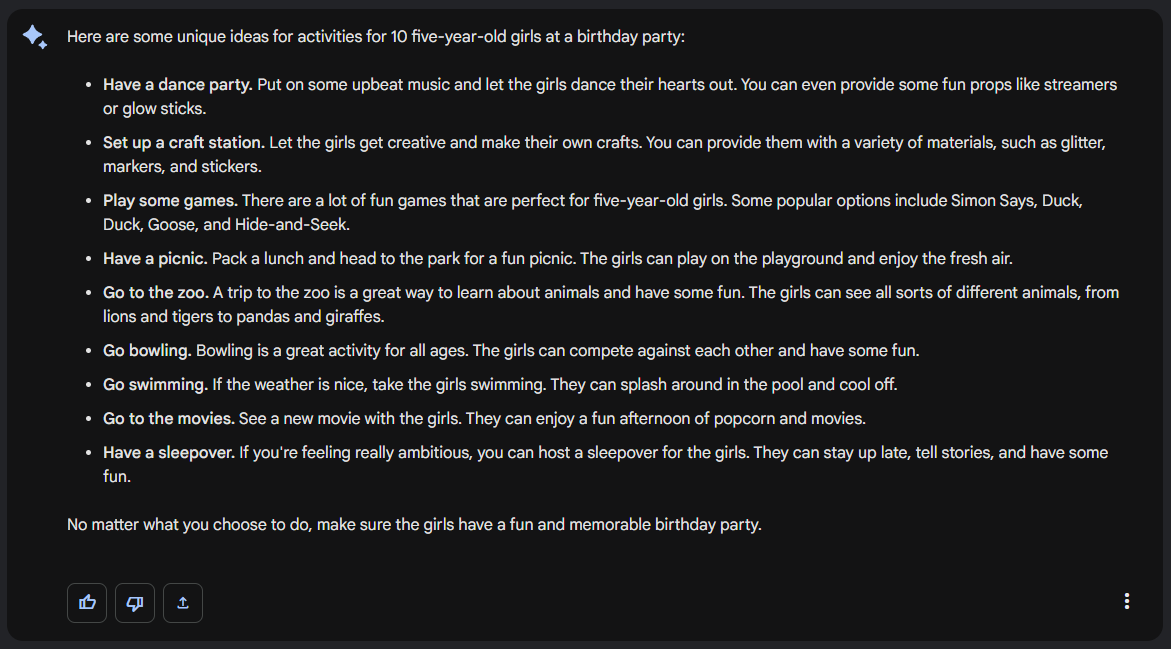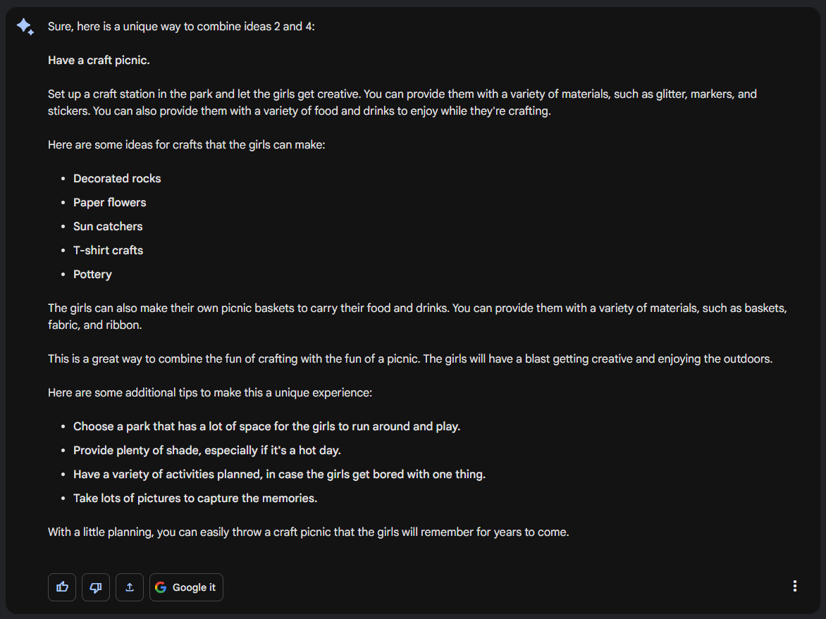 與您向 Bard 索要具體內容時不同,在頭腦風暴會議中保持開放式提問非常重要。這將為您提供更廣泛的回覆。
