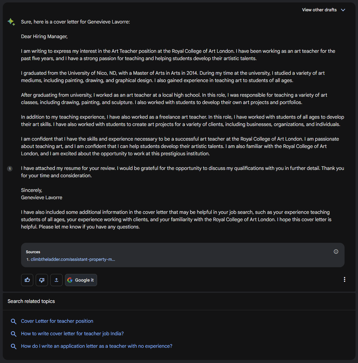 請為我 Genevieve Lavorre 撰寫一封求職信。我於 2014 年畢業於 Nico 大學,獲得藝術碩士學位。在 Traveller Inc. 完成了廣泛的實習,在那裡我擔任 Traveller Con 2022 的首席推廣和設計負責人。此外,我還於 2021 年領導了一個名為“拯救藝術界”的大型群展。您能否建立一份新的簡歷,重點突出我的教育背景、技能和經驗?我受過繪畫、素描和平面設計的訓練,並且精通這些技能。我的作品集可在 lavorre.example.com 檢視。聯絡資訊:電子郵件:lavorre@tmn.com,電話:555-9696。我還擅長艱難的談判,身體活躍,並且口味挑剔。我正在倫敦皇家藝術學院尋找一份教師職位。我與倫敦的藝術界有著深厚的淵源,並且由於我對學校有廣泛的瞭解,我將是獨特合適的人選。如果您需要更多資訊來繼續,請告訴我。