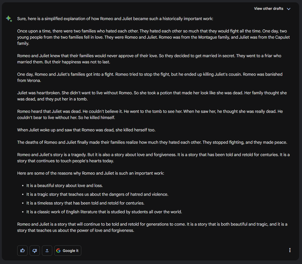 向一個5歲的孩子解釋威廉·莎士比亞寫的《羅密歐與朱麗葉》是如何成為一部具有如此重要歷史意義的作品的。解釋不應超過3個段落。