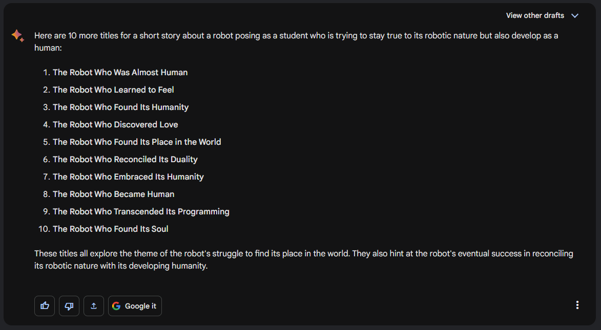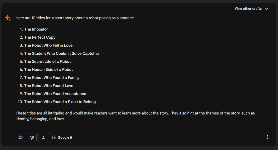 為一個關於機器人冒充學生的短篇故事建議 10 個標題。故事是從一個青少年的視角寫的,這個機器人幾乎是人類的完美複製品。他們找到了朋友並墜入愛河。但他們在瀏覽網際網路時仍然無法解決驗證碼問題。