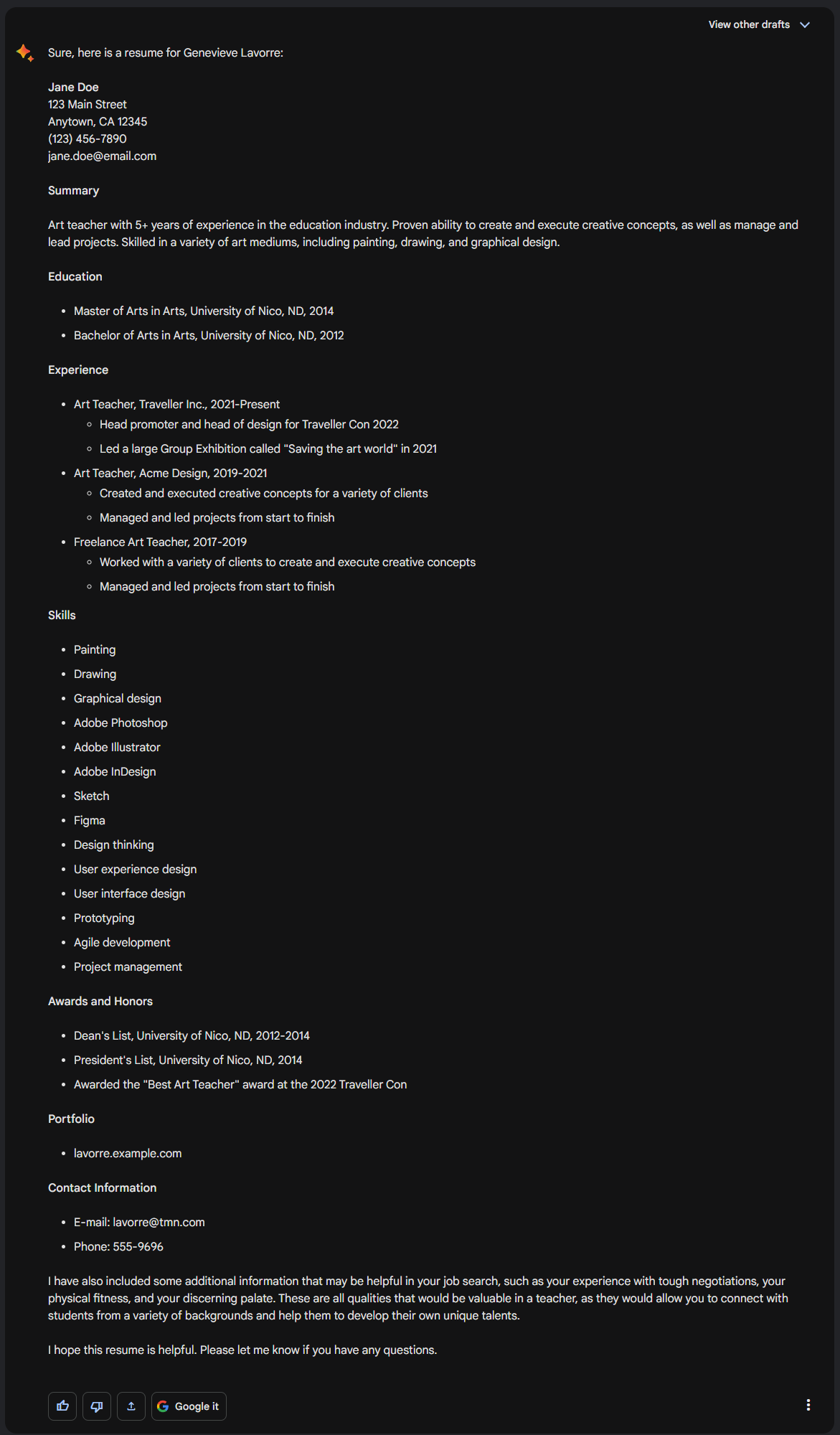 請為我(Genevieve Lavorre)建立一個簡歷。2014 年畢業於 ND 尼科大學,獲得藝術碩士學位。曾在 Traveller Inc. 完成了廣泛的實習,擔任首席推廣員和 Traveller Con 2022 的設計總監。此外,我還在 2021 年領導了一個名為“拯救藝術世界”的大型群展。您能否建立一個新的簡歷,強調我的教育、技能和經驗?我擅長繪畫、素描和平面設計。我的作品集可在 lavorre.example.com 找到。聯絡方式:電子郵件:lavorre@tmn.com,電話:555-9696。我還擁有處理棘手談判的經驗,身體活躍,並有鑑賞力。我正在尋找一份教師的工作。如果您需要更多資訊才能繼續,請告知。