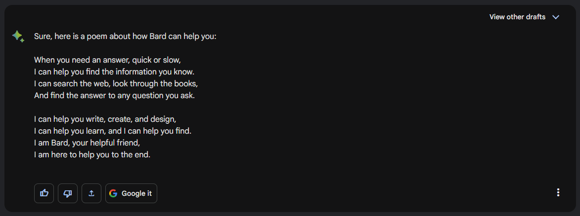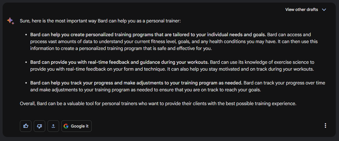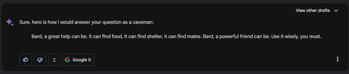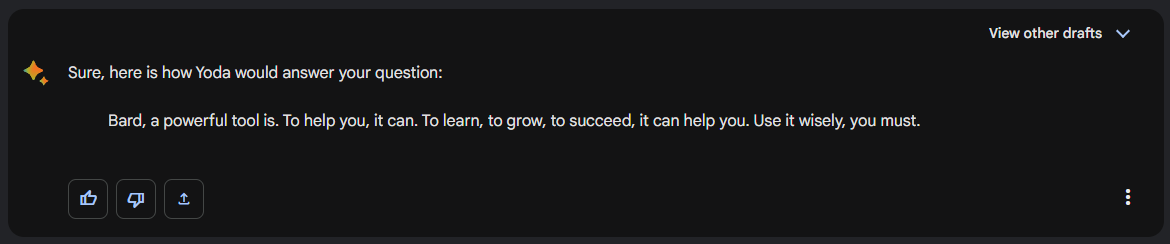 透過給 Bard 分配一個角色,我們添加了上下文。我們甚至可以透過指定我們對它的期望來新增更多細節。