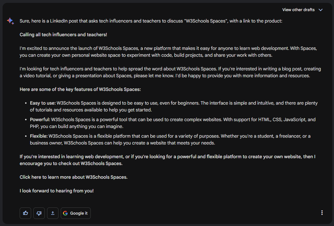 建立一個 LinkedIn 帖子,邀請科技影響者和教師討論“W3Schools Spaces”。包含產品連結。