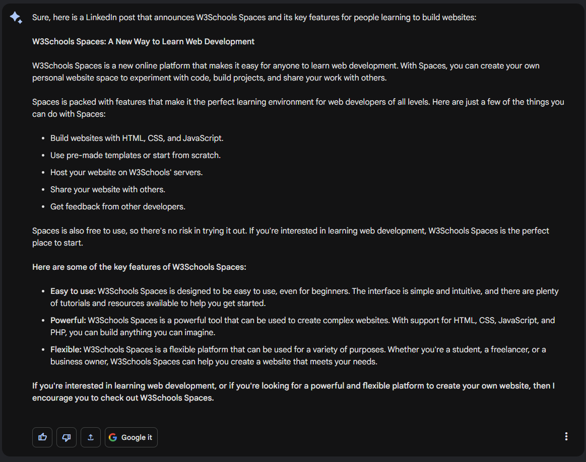 建立一個 LinkedIn 帖子,宣佈“W3Schools Spaces”及其面向正在學習構建網站的人們的主要功能。