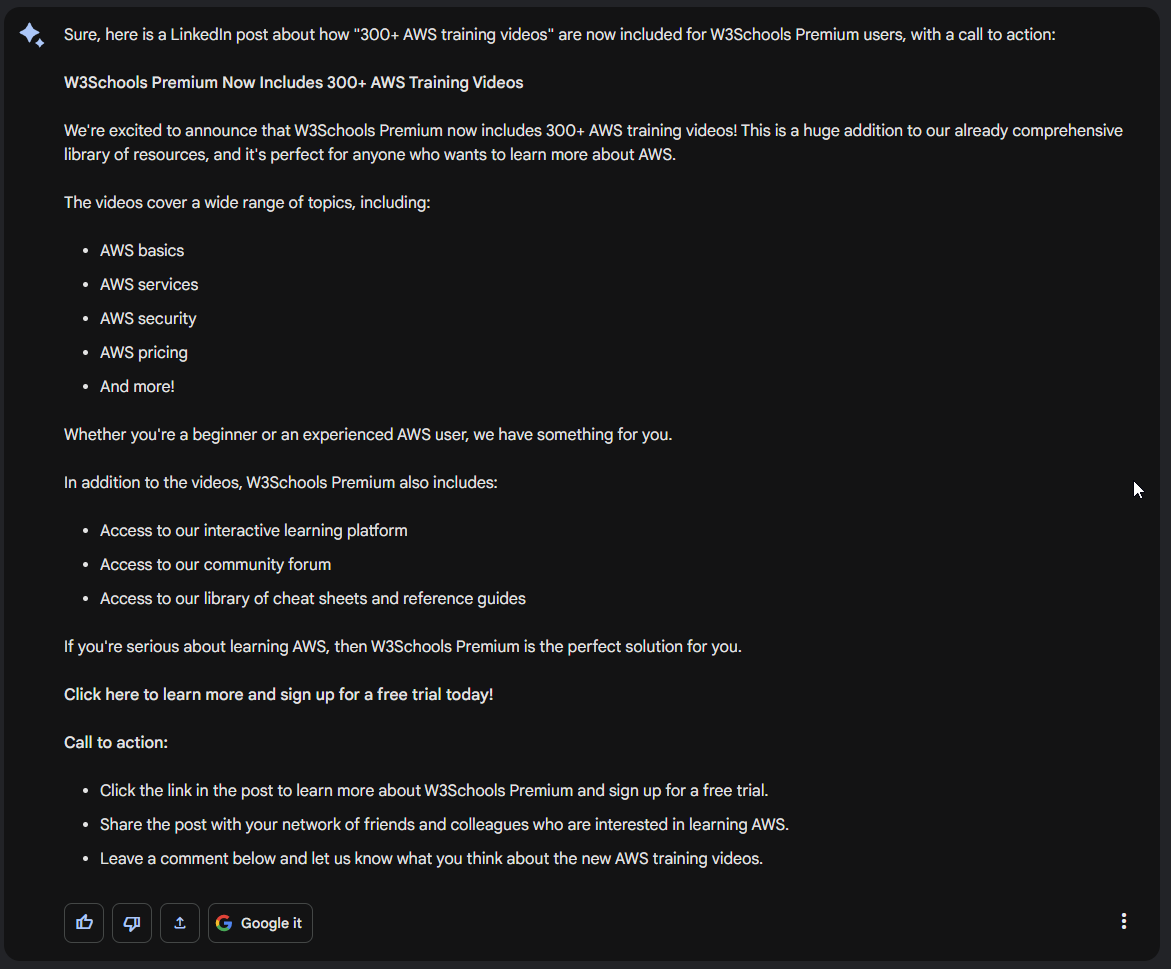 建立一個關於“300 多個 AWS 培訓影片”現已包含在 W3Schools Premium 使用者中的 LinkedIn 帖子。包含號召性用語。