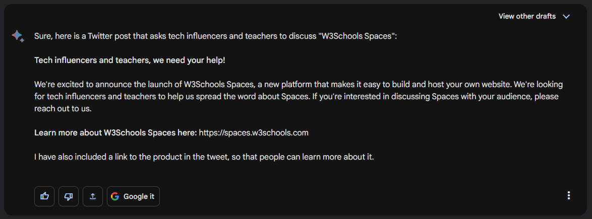 建立一條 Twitter 帖子,邀請技術影響者和教師討論“W3Schools Spaces”。包含產品連結。