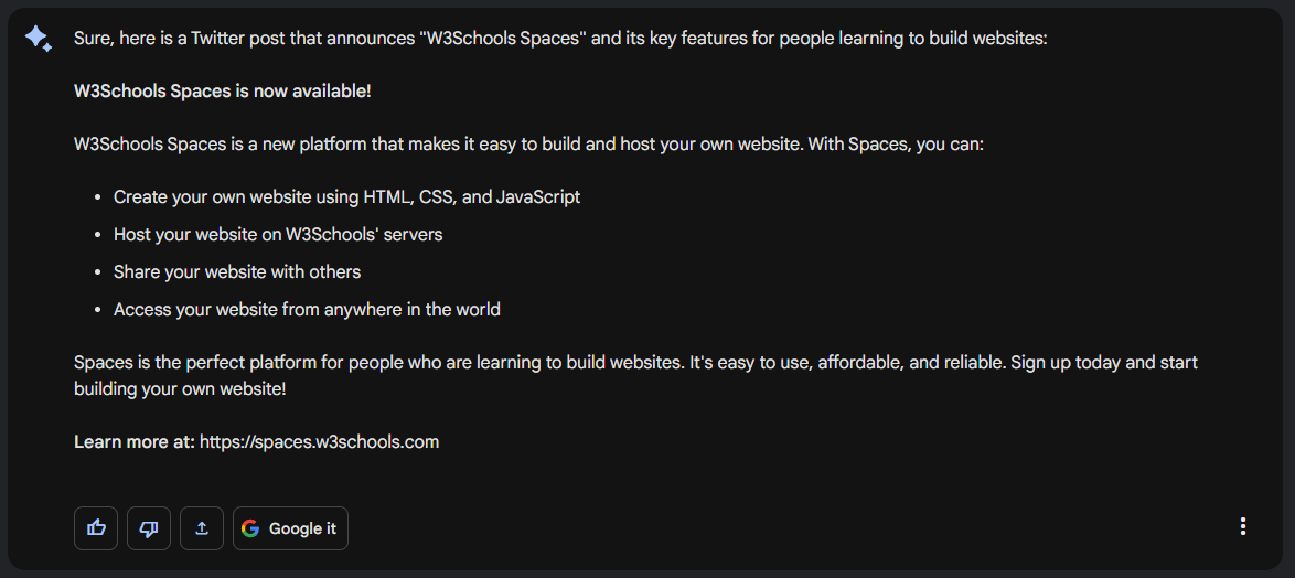 建立一條 Twitter 帖子,宣佈“W3Schools Spaces”及其面向網站開發學習者的關鍵功能。