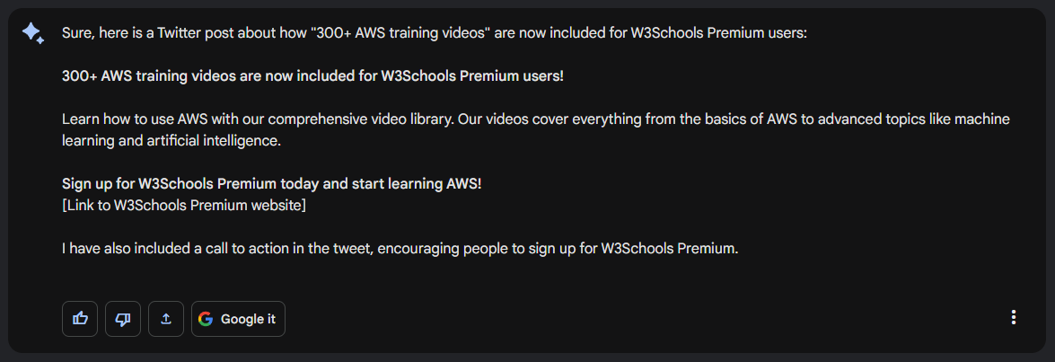 建立一條 Twitter 帖子,宣佈 W3Schools Premium 使用者現已包含“300 多個 AWS 培訓影片”。包含一個行動號召。
