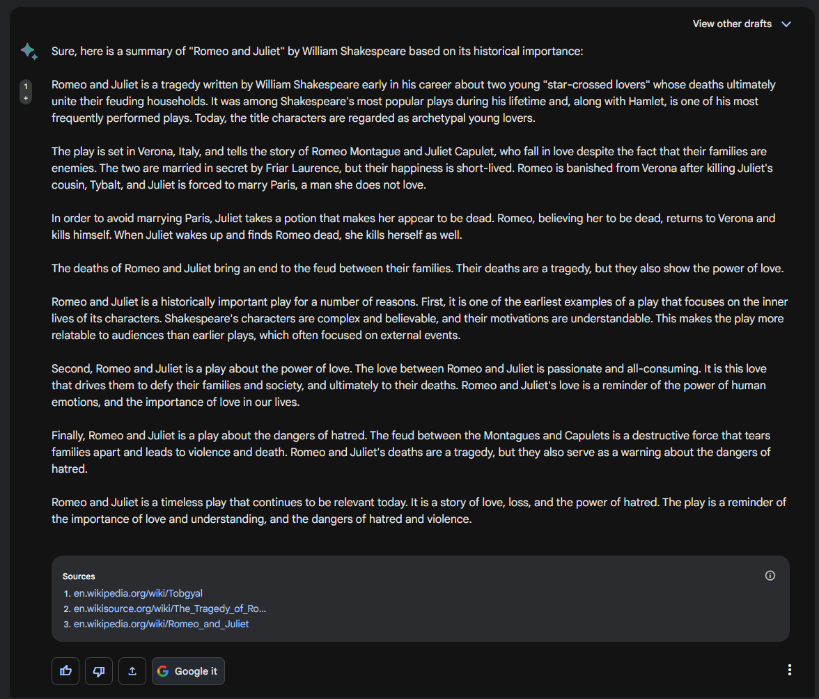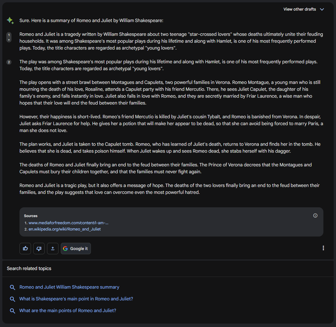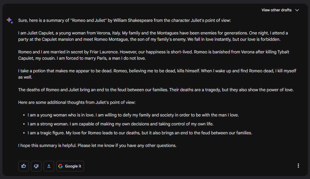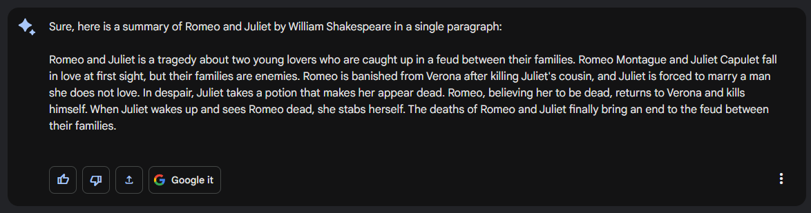 前面的例子提供了《羅密歐與朱麗葉》的基本摘要,但我們嘗試以幾種不同的方式提問