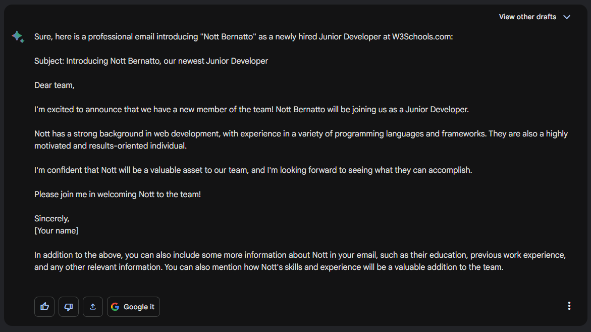 撰寫一封專業的郵件,介紹“Nott Bernatto”為 W3Schools.com 新聘的初級開發人員。
